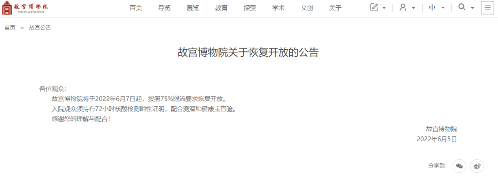 故宫博物院6月5日发布公告称,将于6月7日起,按照75%限流要求恢复开放。入院观众须持有72小时核酸检测阴性证明,配合测温和健康宝查验。(记者施雨岑)