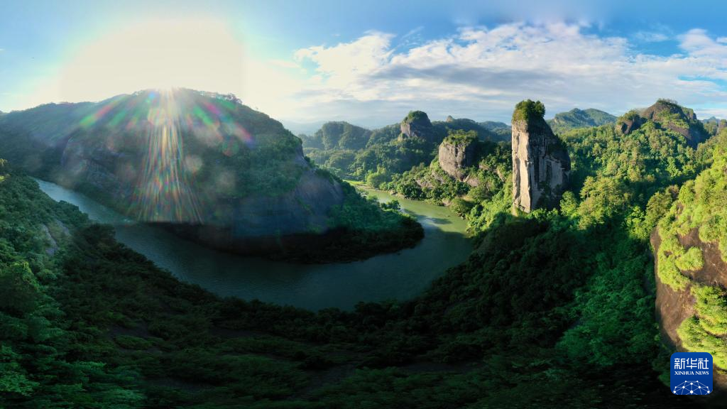 武夷山的自然风光独树一帜,核心景区属丹霞地貌,景区内一条幽深清澈的九曲溪盘环山中,两岸丹崖林立,千姿百态。千百年来,得天独厚的地理环境和自然条件,孕育了武夷山举世称奇的生物多样性。