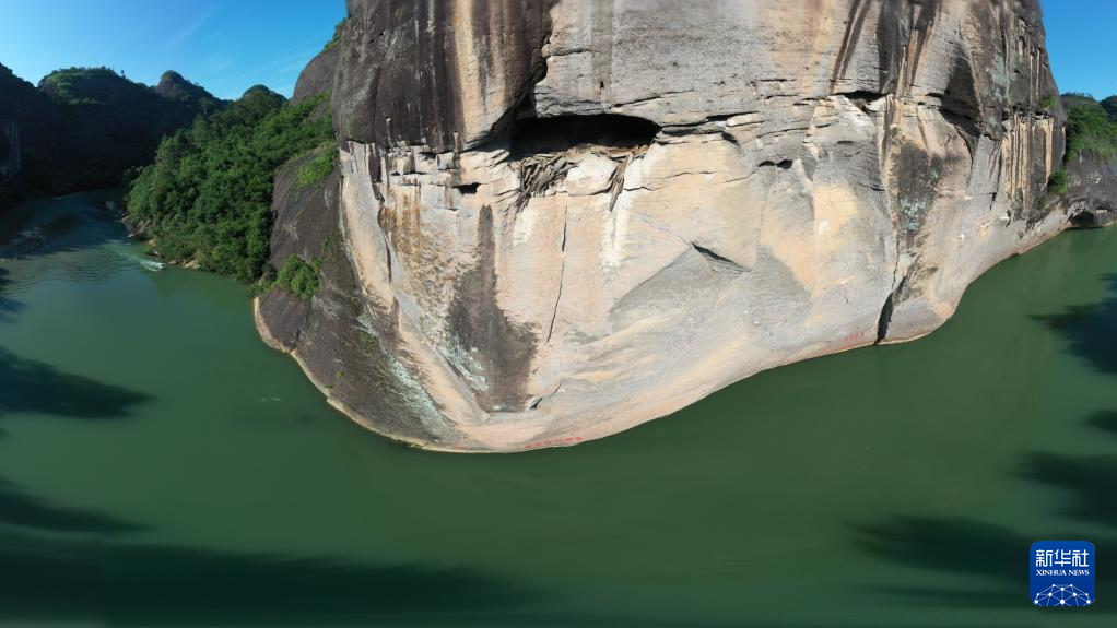 武夷山九曲溪畔丹霞石壁上的架壑船棺(6月6日摄,无人机照片)。架壑船棺和虹桥板是当地古闽族的葬俗遗迹。