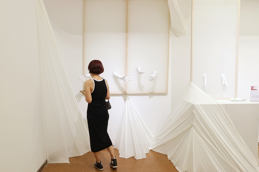 6月10日,观众在“非遗·当代”板块观看作品《取·与》。中国日报记者 姜东 摄