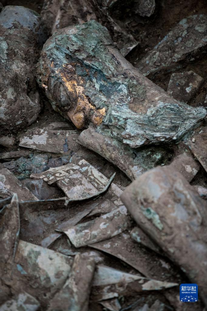 这是在三星堆遗址8号“祭祀坑”拍摄的金面罩铜头像(6月1日摄)。新华社记者 王曦 摄
