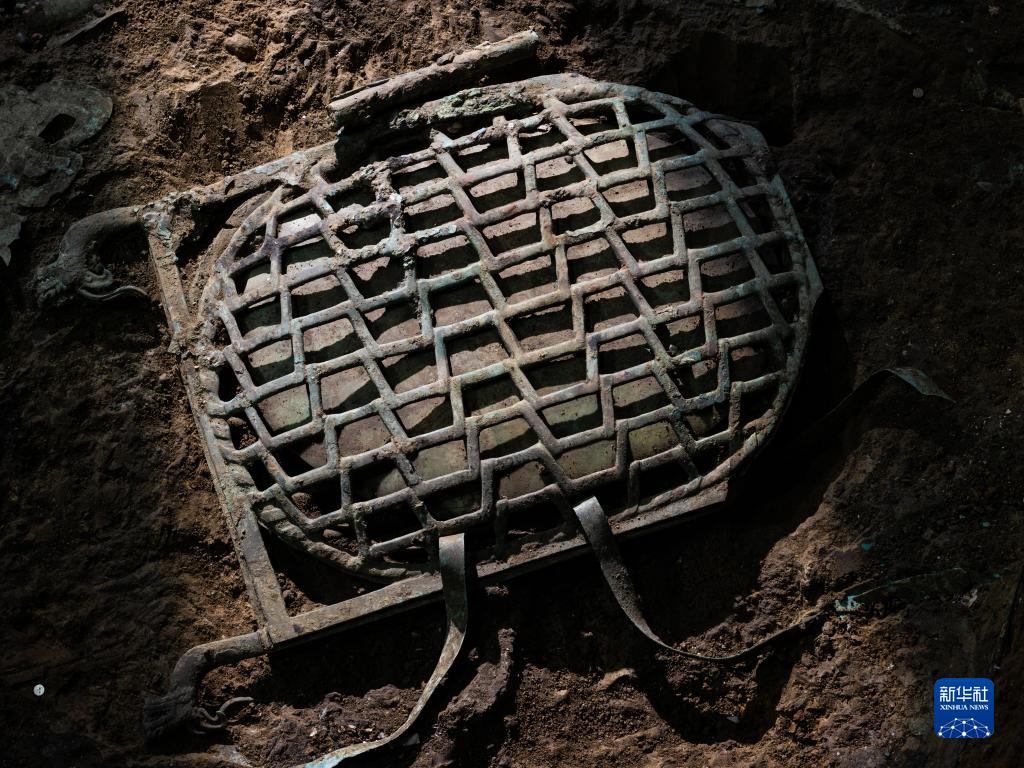 这是在三星堆遗址7号“祭祀坑”拍摄的龟背形网格状器(6月1日摄)。新华社记者 沈伯韩 摄