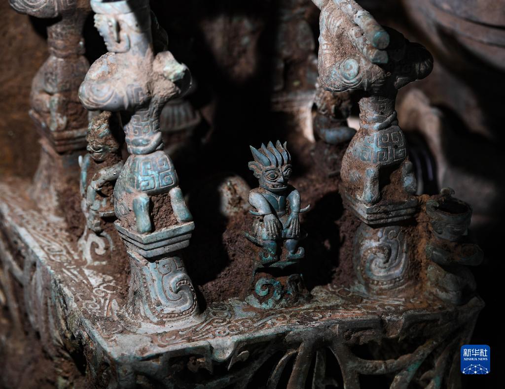 这件文物去年已经被发现,经过数月小心翼翼地清理,它复杂精美的构造显露出来。青铜神坛由低到高分三个部分,底部是带镂空花纹的台基,台基上一个平台,平台每一面正中心分别坐着一个人,五绺立发,身着飘带彩衣,脚蹬云头鞋。还有一组高大的“力士”分别跪坐在一个刻有纹饰的小台基上,合力扛起一只小神兽。小神兽背上还骑着一个穿裙子的人,小神兽脖子被三股铜丝做成的绳子拴起来,绳上扣有一个精巧的小铜环。