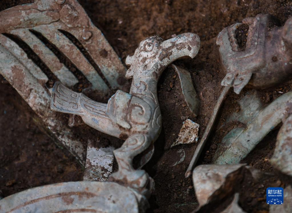 这是在三星堆遗址8号“祭祀坑”拍摄的铜神鸟(6月1日摄)。新华社记者 王曦 摄