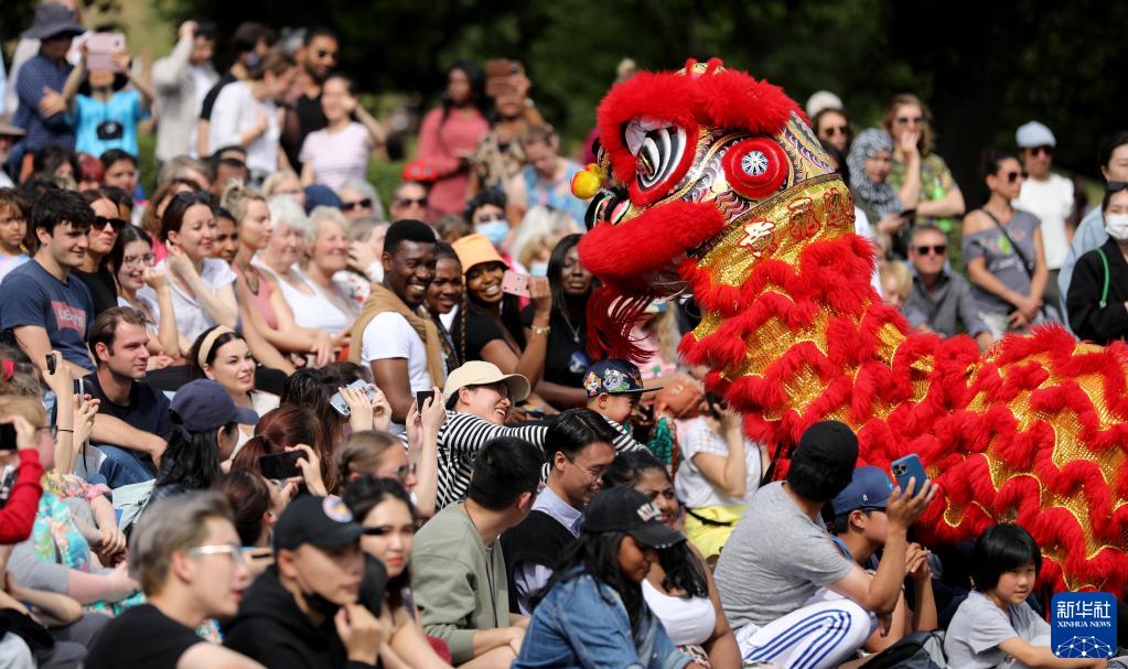 7月17日,在英国苏格兰爱丁堡,当地民众在舞狮节目中与“狮子”互动。