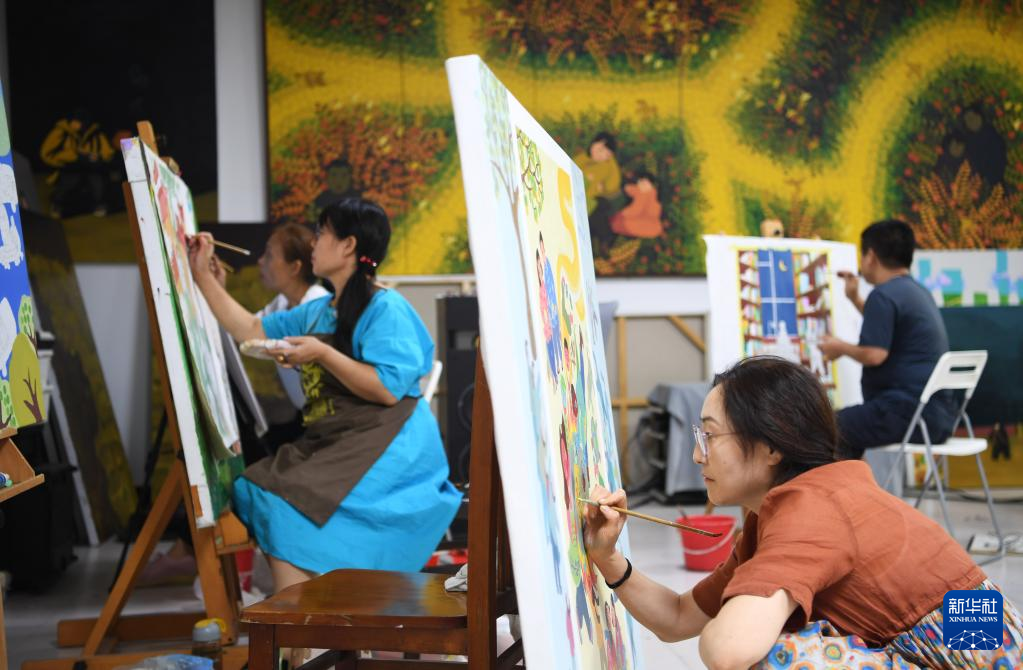 8月17日,在河南省漯河市舞阳农民画院,画家们在创作农民画。