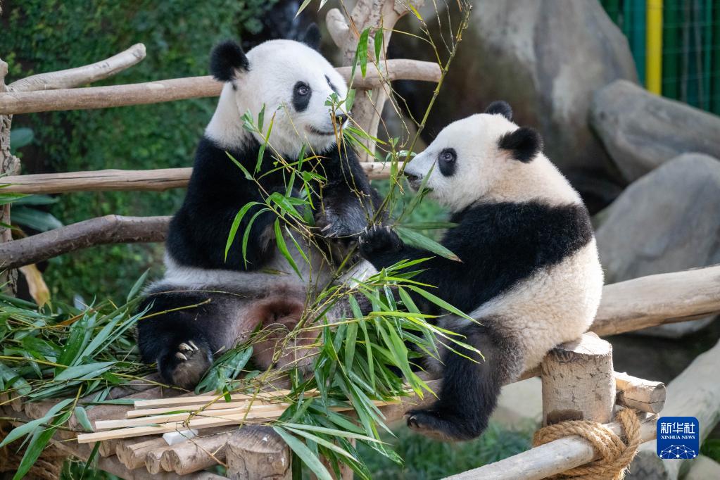 8月21日,在马来西亚吉隆坡附近的马来西亚国家动物园,大熊猫“靓靓”(左)与“升谊”吃竹子。