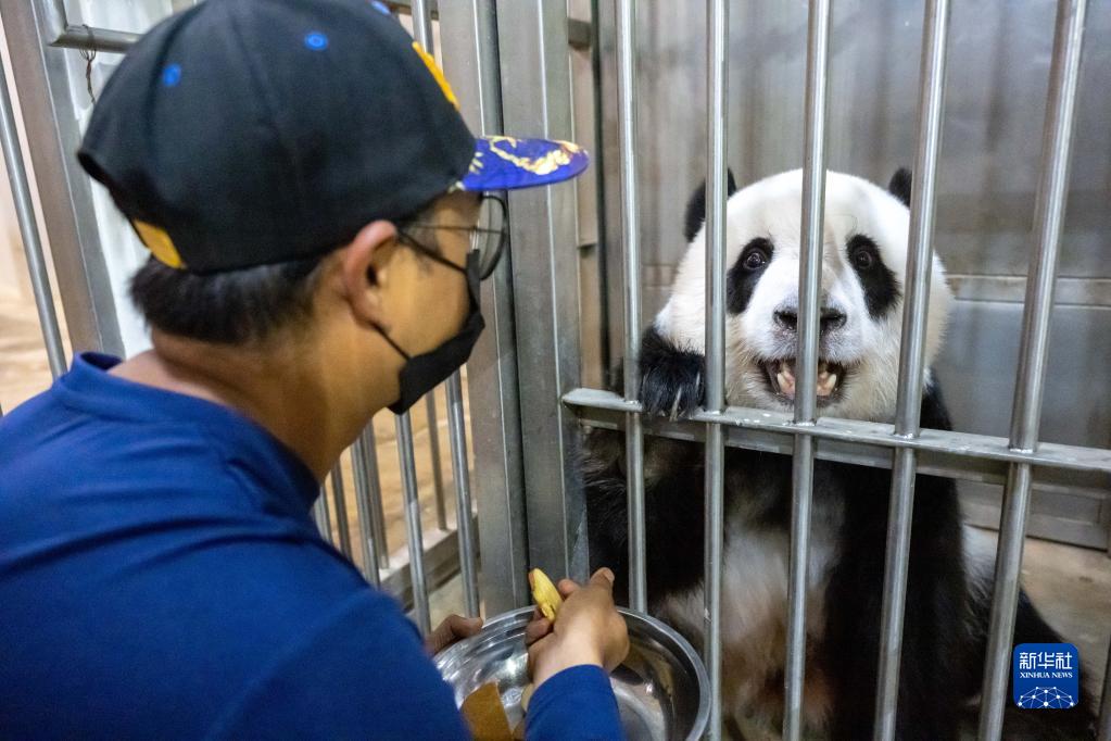 8月21日,在马来西亚吉隆坡附近的马来西亚国家动物园,饲养员阿克迈勒给大熊猫“谊谊”喂早餐。