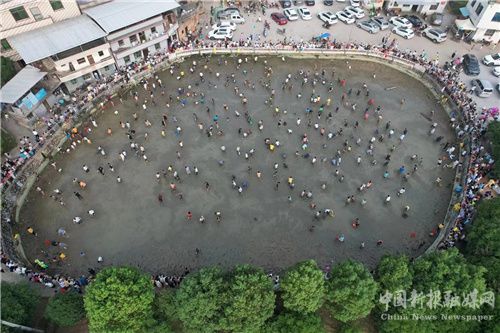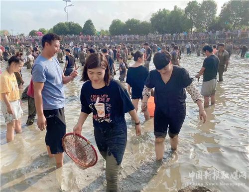9月10日一大早,湖南省郴州市宜章县黄沙镇大元村中心的鱼塘边人头攒动,非常热闹。全村男女老少在鱼塘里捕鱼,展现出一幅人乐鱼欢庆中秋的场景。