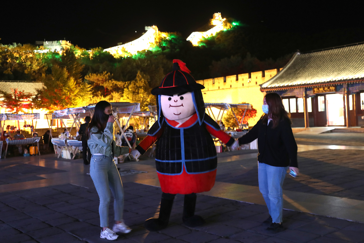9月23日,游客与八达岭长城玩偶“明小兵”互动。中国日报记者 邹红 摄