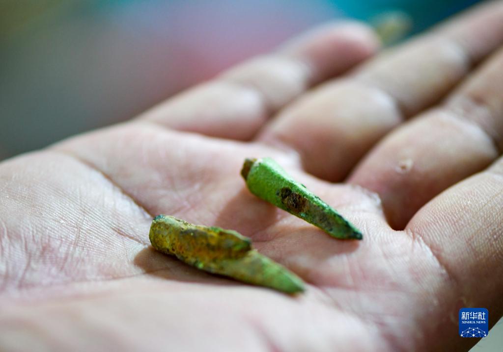 9月27日,考古发掘队队员程涛在临时库房内展示出土的铜制箭镞。