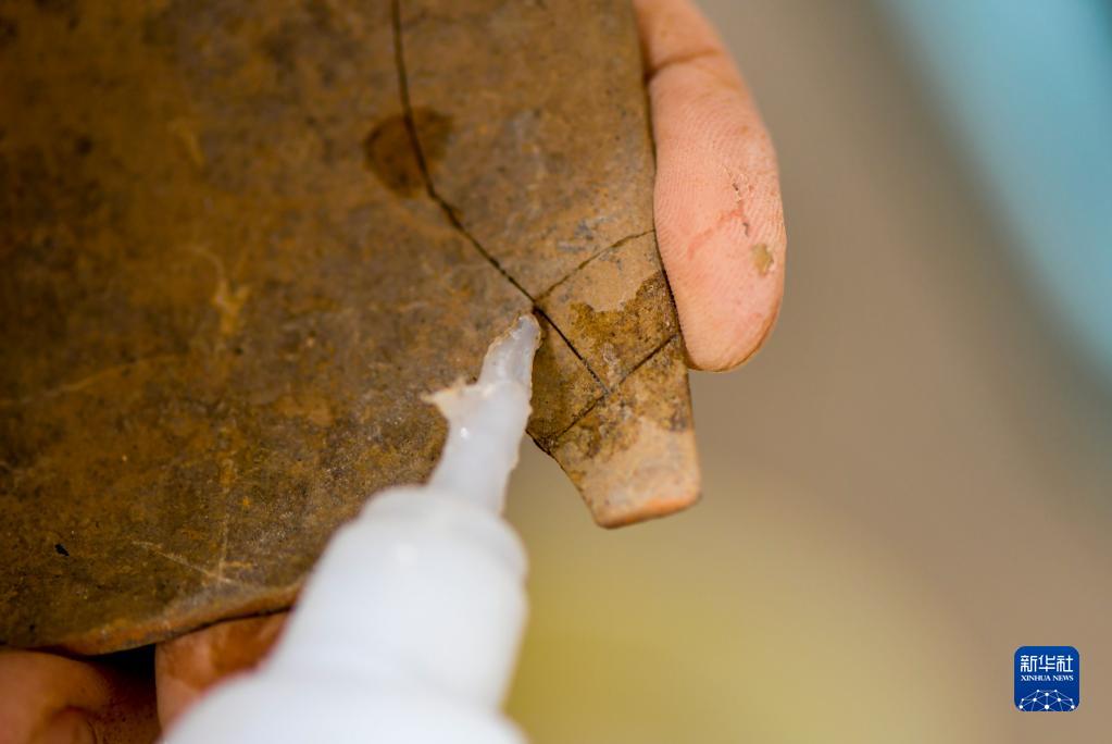 9月27日,考古发掘队队员王朋成在临时库房内,用胶水拼接出土的陶器。