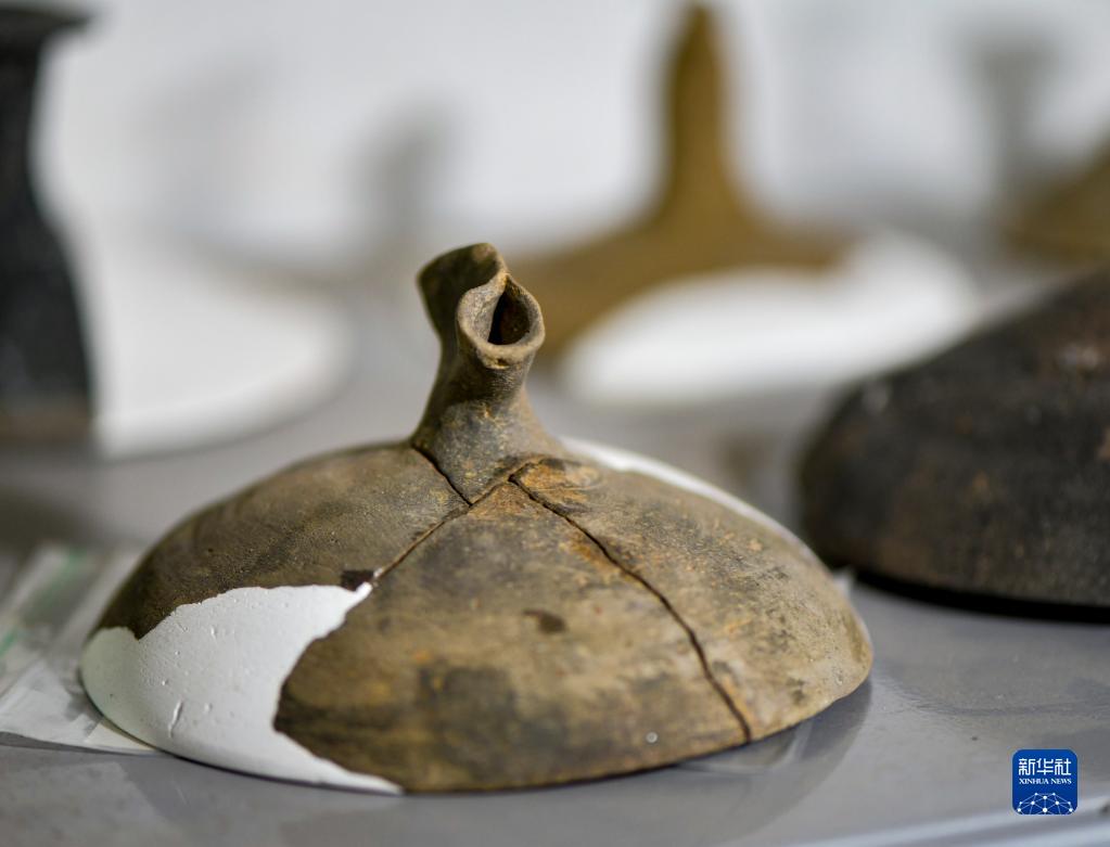 这是此次考古发掘出土的陶制器盖(9月27日摄)。