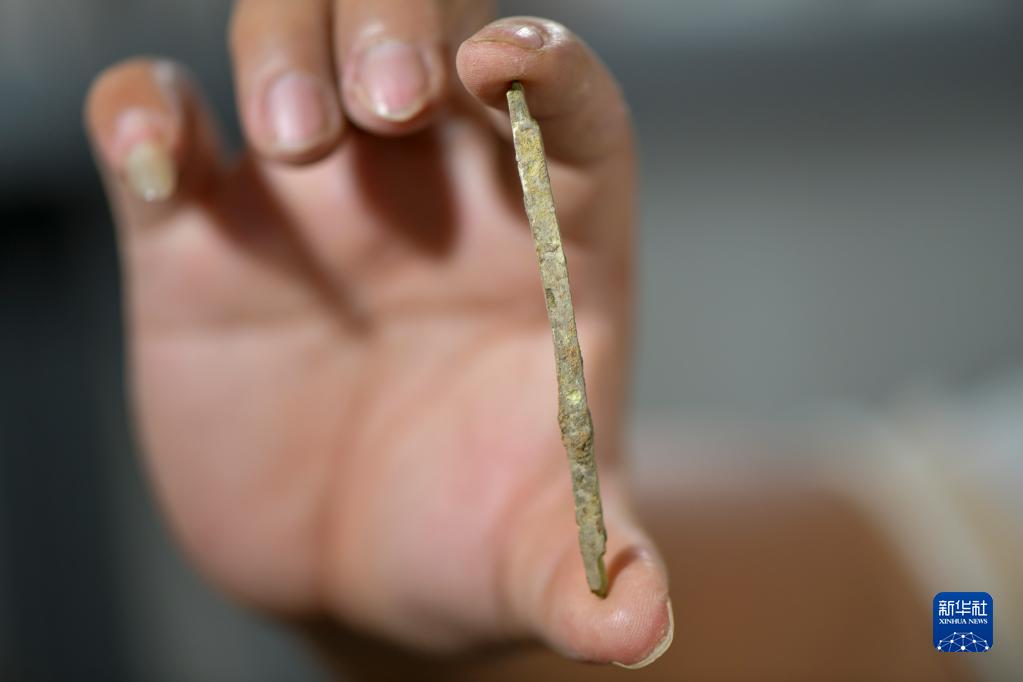 9月27日,考古发掘队队员程涛在临时库房内展示出土的铜簪。