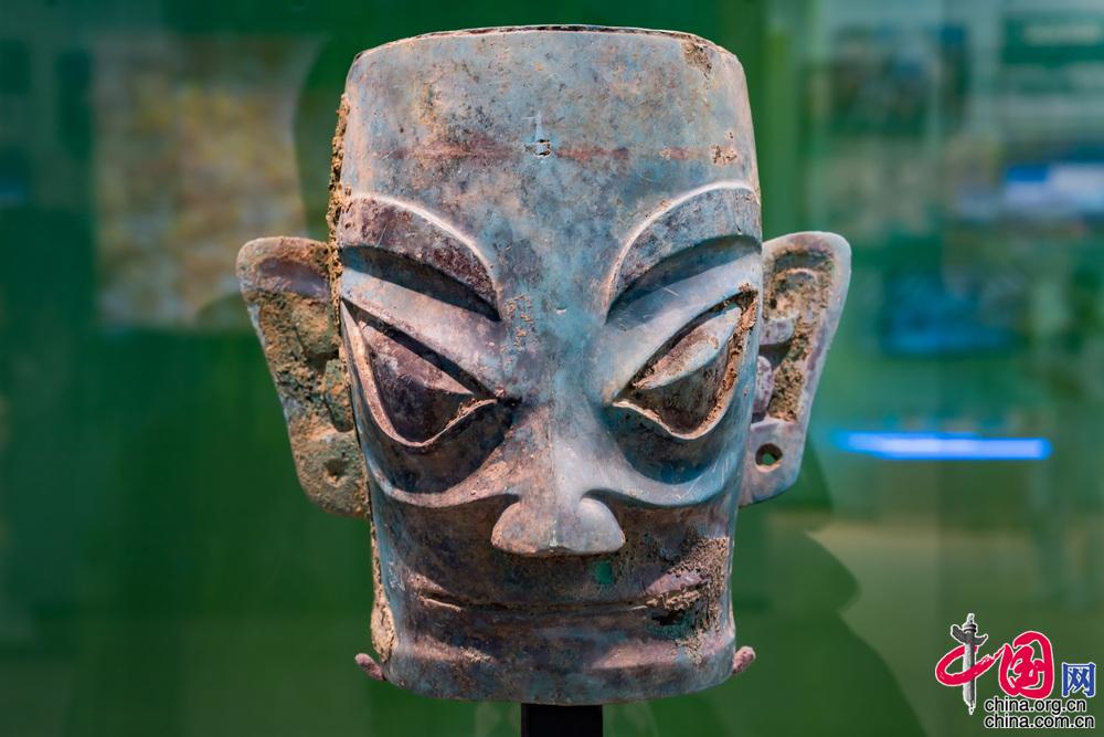三星堆遗址8号祭祀坑出土的铜人像(真品)。中国网 郑亮摄影