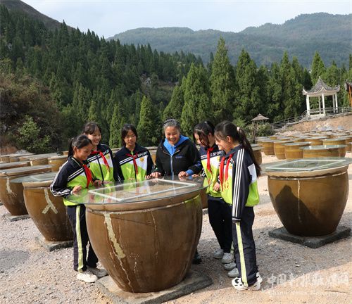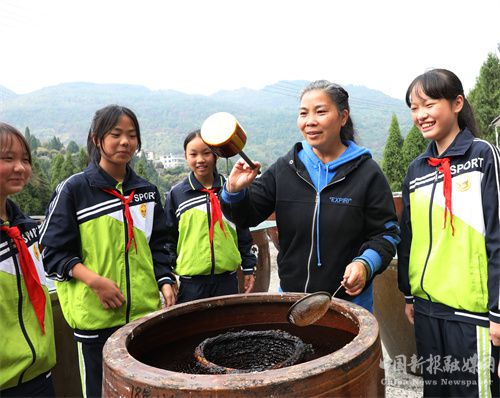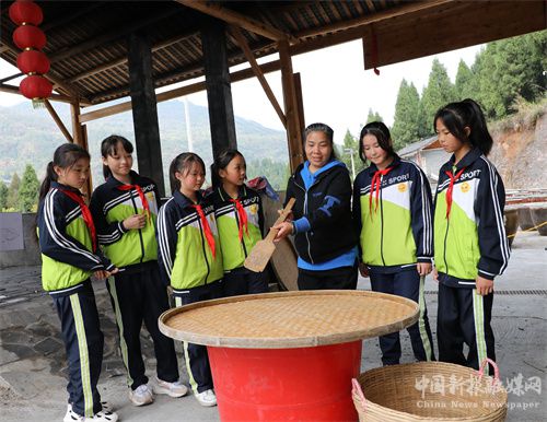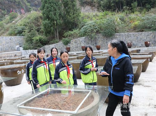 11月13日,在湖南省保靖县迁陵镇,州级非遗项目“保靖酱油”传承人给学生讲解酱油酿造工艺。近年来,该县加强传统文化教育,在各学校开设丰富多彩的非遗及传统文化课堂,让孩子们在潜移默化中接受传统文化的熏陶,认知和传承传统手艺。( 俞采华)