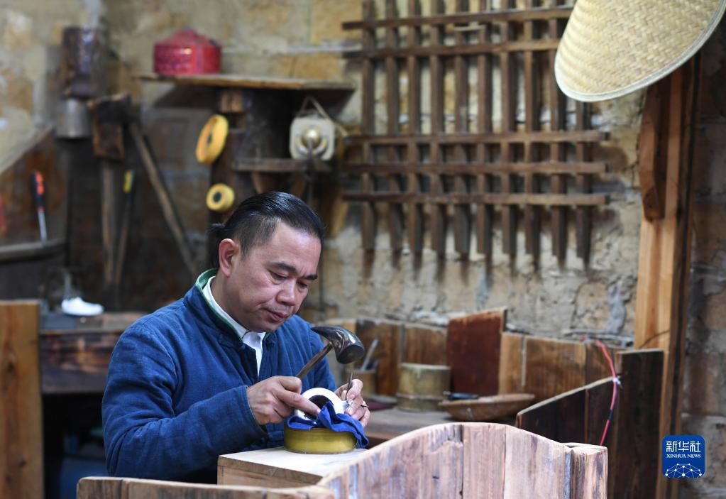 在贵州省黔东南苗族侗族自治州丹寨县卡拉村,银饰锻造技艺传承人王国春在锻造银制器具(11月16日摄)。新华社记者 杨文斌 摄