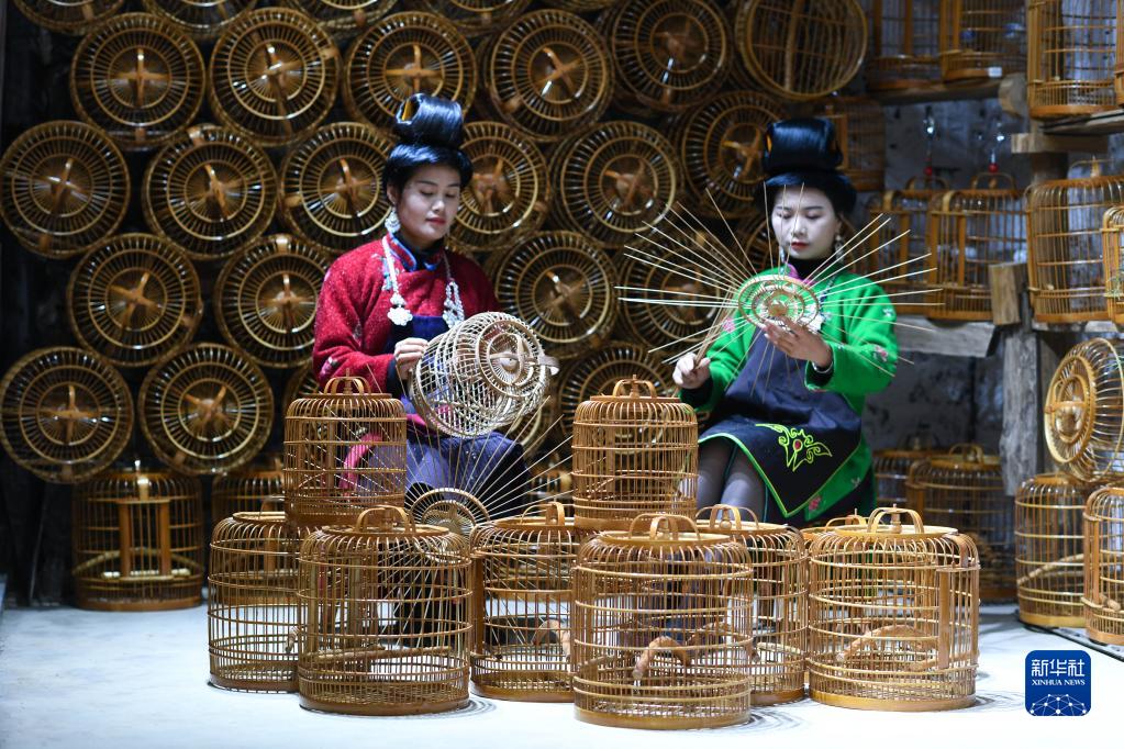 在贵州省黔东南苗族侗族自治州丹寨县卡拉村,鸟笼制作技艺非遗传承人王秋(右)在编制鸟笼(11月16日摄)。新华社记者 杨文斌 摄