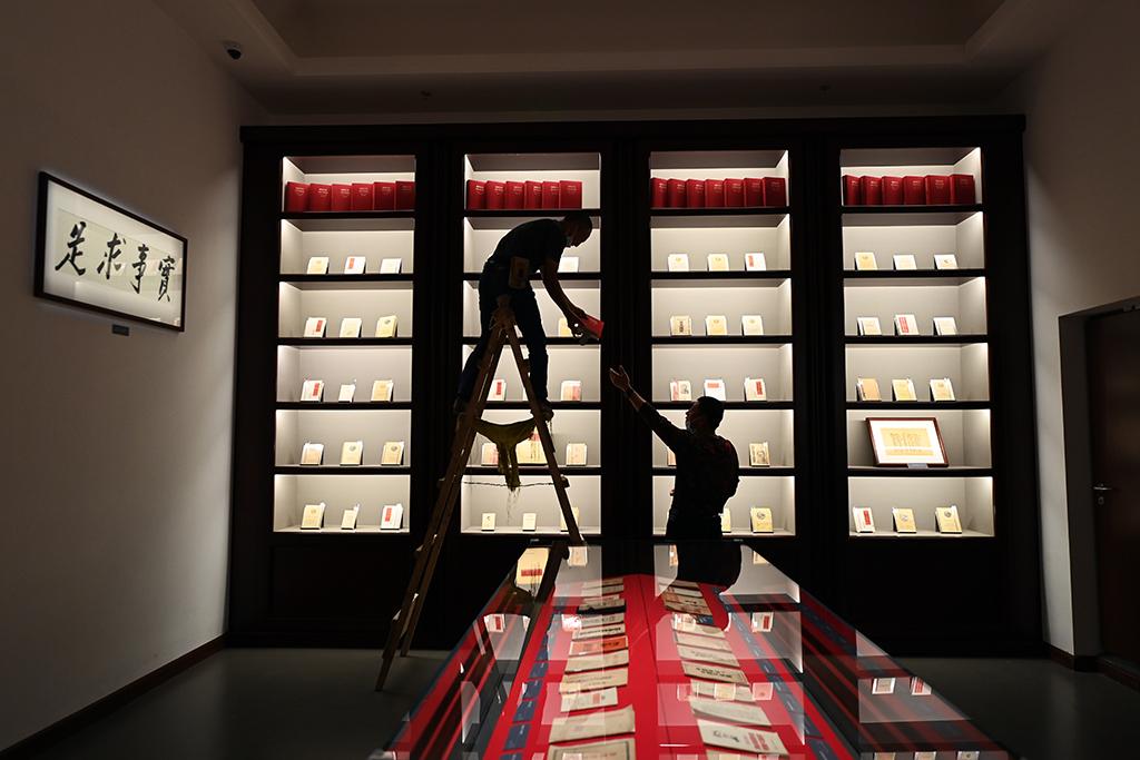 9月28日,中央总馆“真理之光”展区,工作人员在调整展陈。