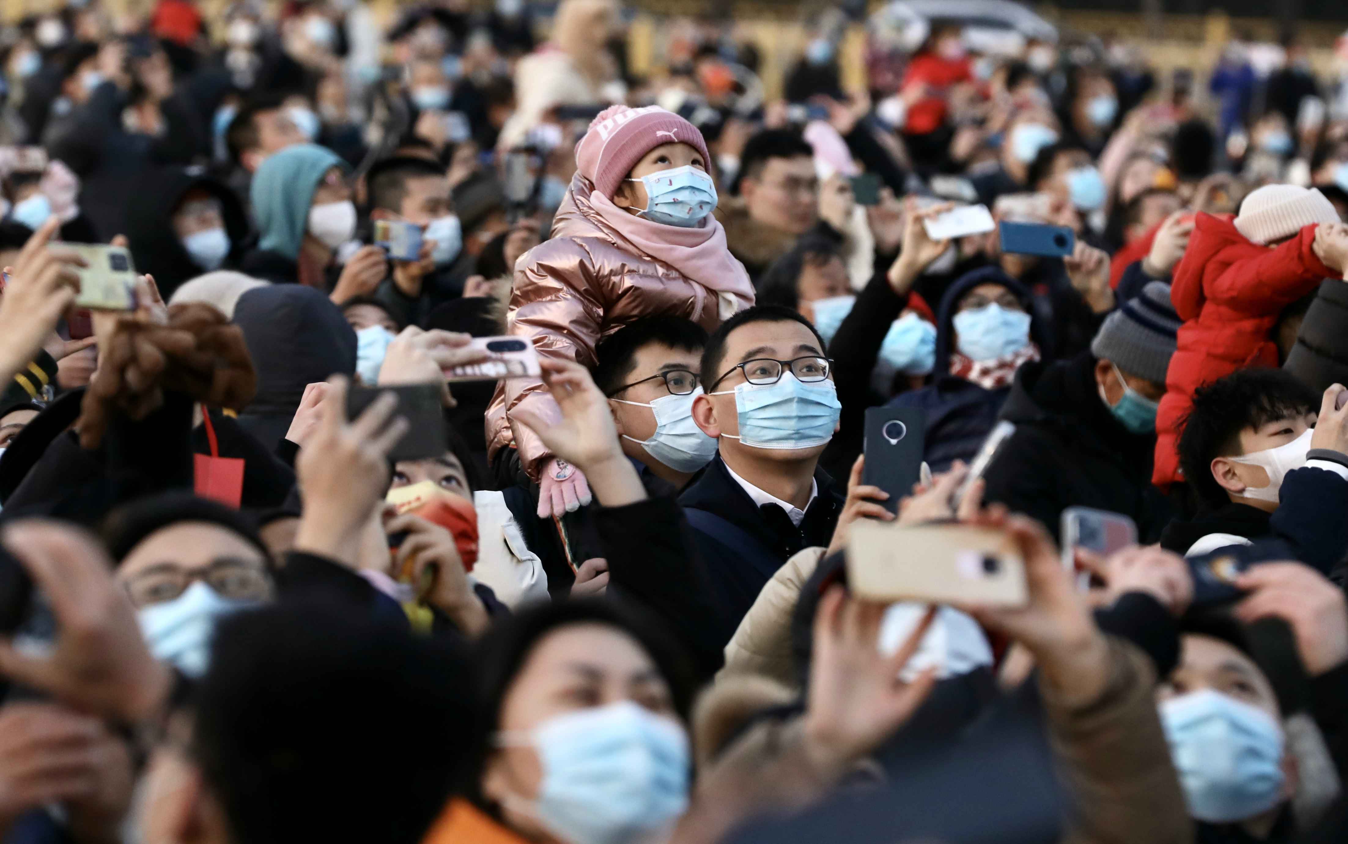 1 月 1 日清晨,游客在北京天安门广场拍摄新年首场升国旗仪式。 中国日报记者 朱兴鑫 摄