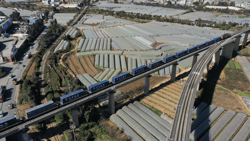 1月10日,首趟“澜湄快线”列车满载云南鲜花、蔬菜等产品从昆明王家营西站始发,将于次日抵达老挝首都万象。