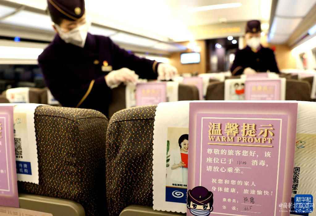1月16日,乘务员在上海虹桥开往汉口的G1724次列车上布置消毒提示卡。