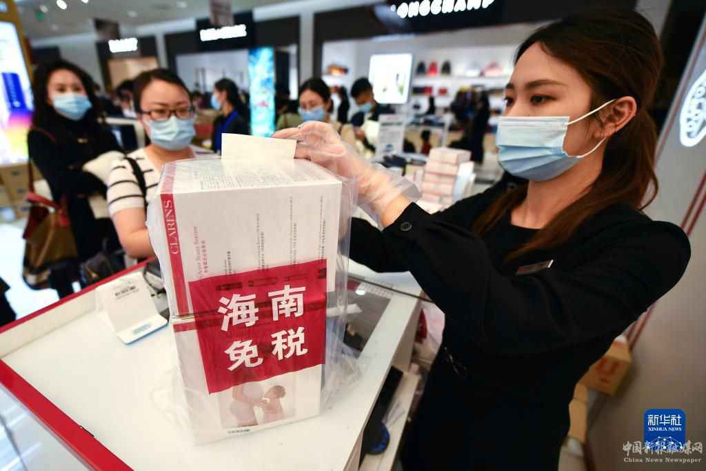 海口日月广场免税店的工作人员在打包免税品(2021年1月7日摄)。新华社记者 郭程 摄