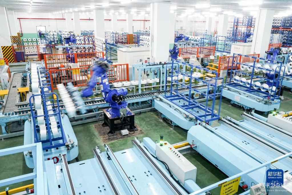 在位于江苏省苏州市吴江区盛泽镇的一家智能车间,机器人在车间内自动作业(2021年5月14日摄)。新华社记者 李博 摄