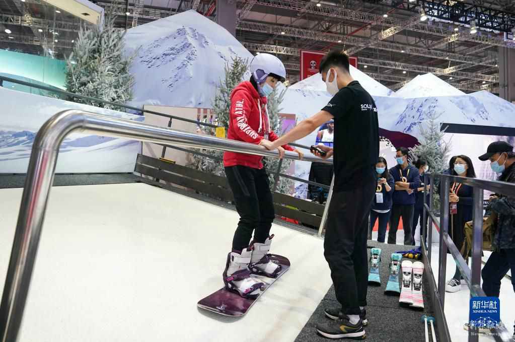 2021年11月5日,参观者在进博会消费品展区的一家展台体验滑雪。新华社记者 丁汀 摄