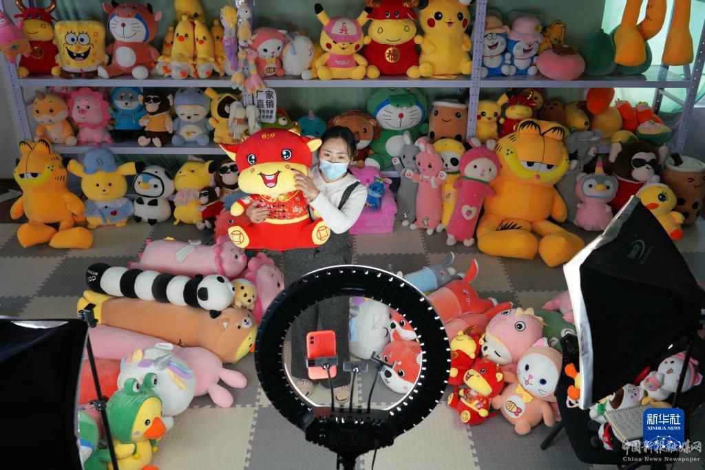 2021年2月6日,在河北省邢台市内丘县跨境电子商务产业园,商户直播销售毛绒玩具。新华社发(刘继东 摄)