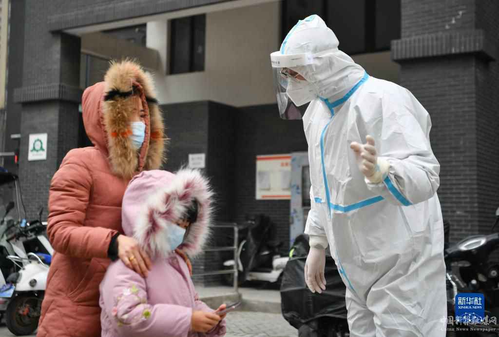 2021年12月27日,在西安市雁塔区孟村小区,工作人员向居民介绍核酸检测注意事项。新华社记者 张博文 摄