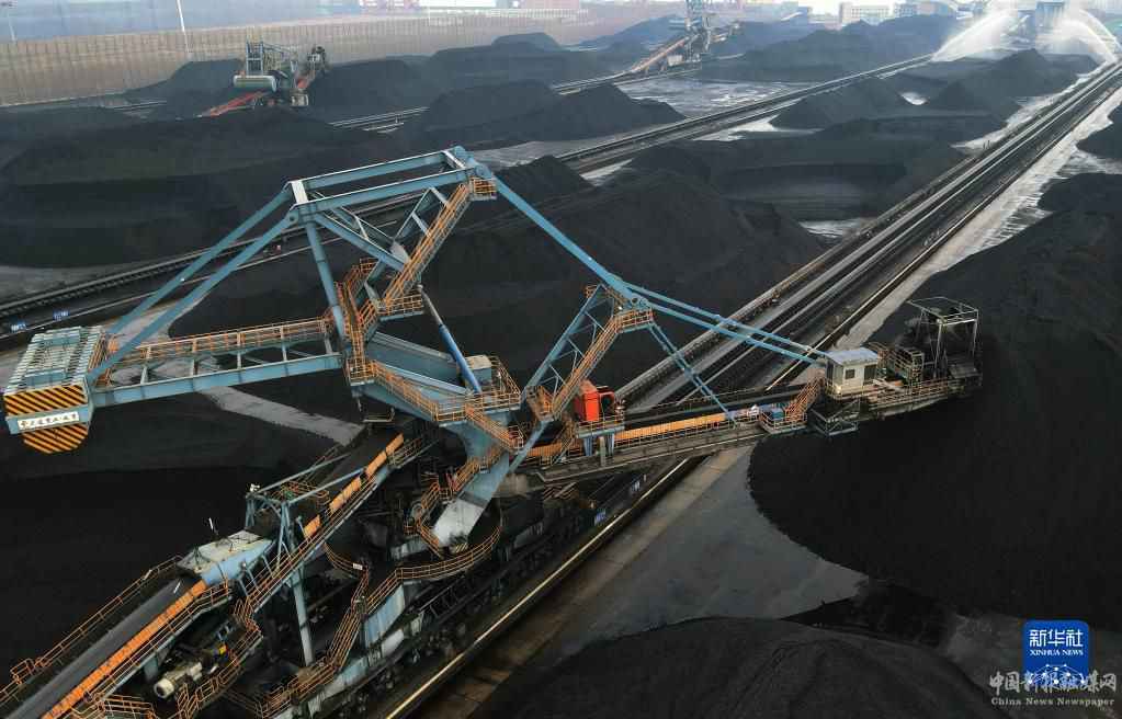 2021年12月8日,唐山港京唐港区煤炭堆场的堆料机在工作中(无人机照片)。新华社记者 杨世尧 摄