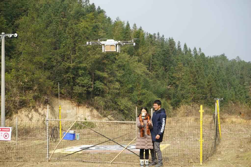 伴随着螺旋桨的嗡鸣声,约两米长的无人机载着打包好的土鸡、鸡蛋从机坪上稳稳升空,飞往山外的无人机运营中心。