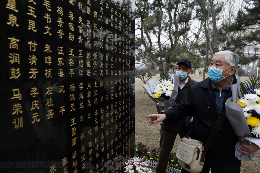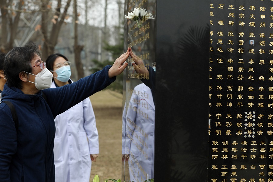 3月24日,捐献者家属在现场触摸纪念墓碑的名字。中国日报记者 朱兴鑫 摄