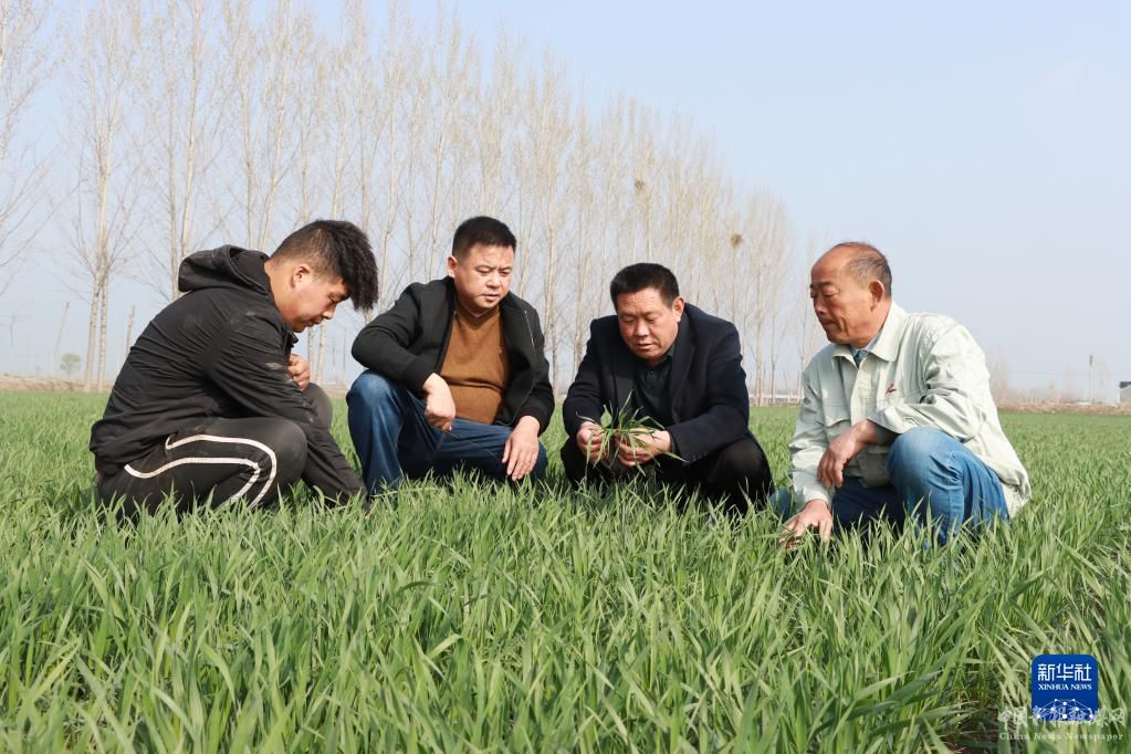 这是山东汶上县苑庄镇道立种植农民专业合作社理事长张道立(右二)与同事查看苗情(3月24日摄)。新华社发