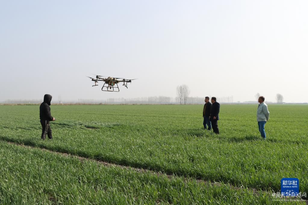 这是山东汶上县苑庄镇道立种植农民专业合作社社员用农用无人机喷洒农药(3月24日摄)。新华社发(刘娜摄)