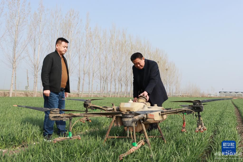 这是山东汶上县苑庄镇道立种植农民专业合作社理事长张道立(右)查看农用无人机(3月24日摄)。新华社发(刘娜摄)