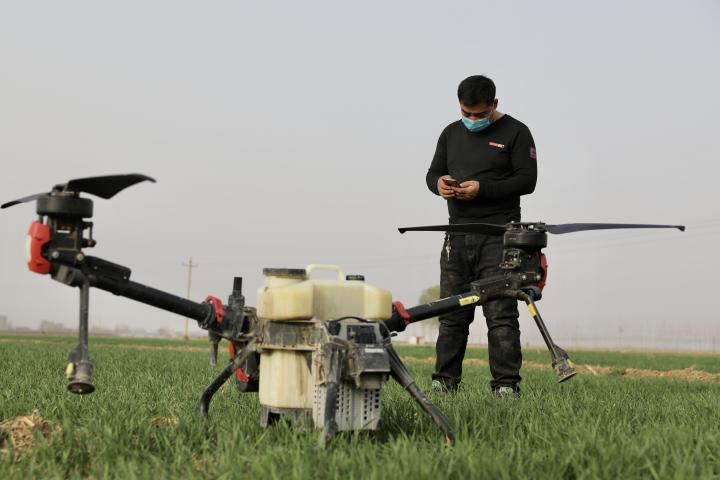 在河北省邢台市宁晋县唐邱镇唐邱一村的麦田里,农民正在通过手机的智能软件将地块位置信息输入无人机系统内。(邢台市委宣传部供图)