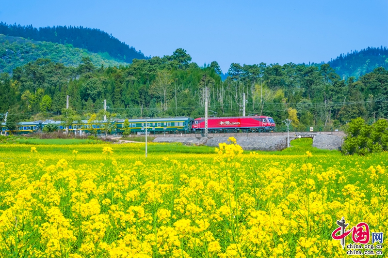(2021年3月16日,云南铁路旅游专列穿过云南省曲靖市罗平油菜花海。尚建松摄)