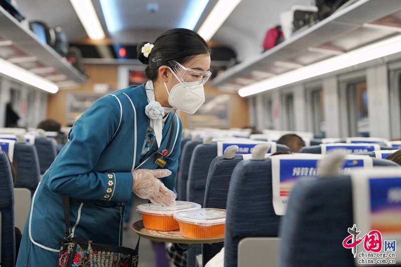 (乘务员为旅客提供盒饭。徐章位摄)