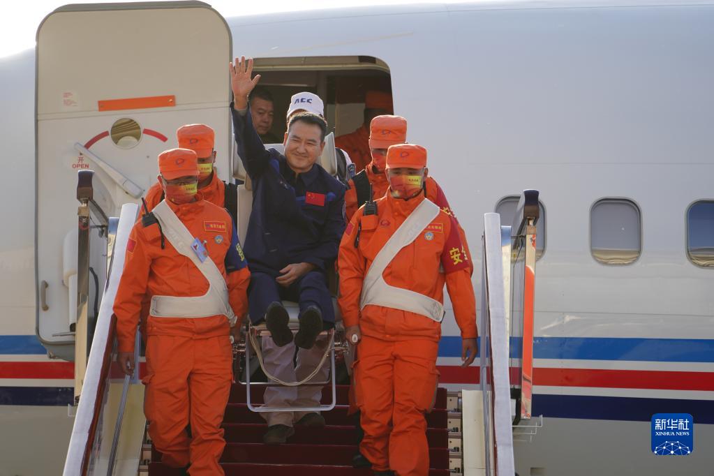圆满完成神舟十三号载人飞行任务的航天员翟志刚、王亚平、叶光富,于2022年4月16日下午乘坐任务飞机平安抵达北京。空间站阶段飞行任务总指挥部领导和成员到机场迎接。