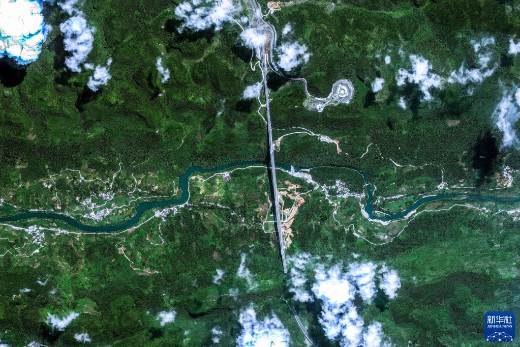 2022年8月15日卫星拍摄的贵州平塘特大桥。卫星视角之下,高桥宛如纽带,跨越深邃的峡谷、沟壑,将纵横的群山紧密相连。新华社发