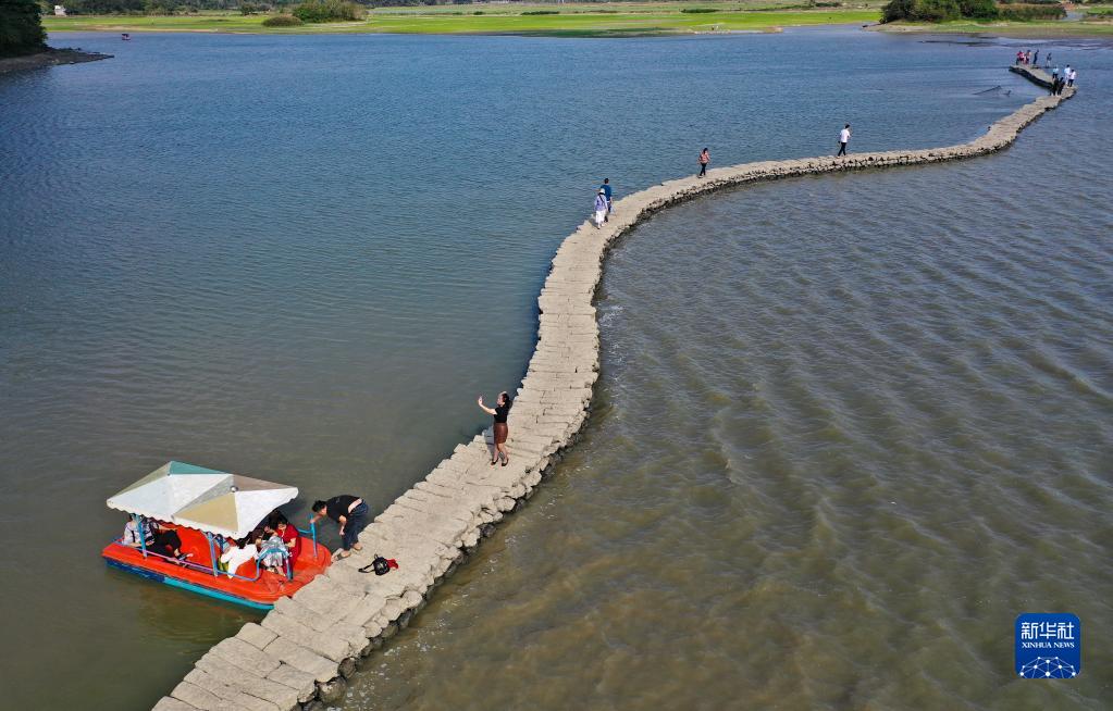 国仓村石桥位于海口市琼山区龙塘镇,距今有500余年历史,因形状弯曲似蛇,被当地人称为“蛇桥”。蜿蜒的石桥水涨则没,水退则显,一年只在初春至初夏时节露出水面。