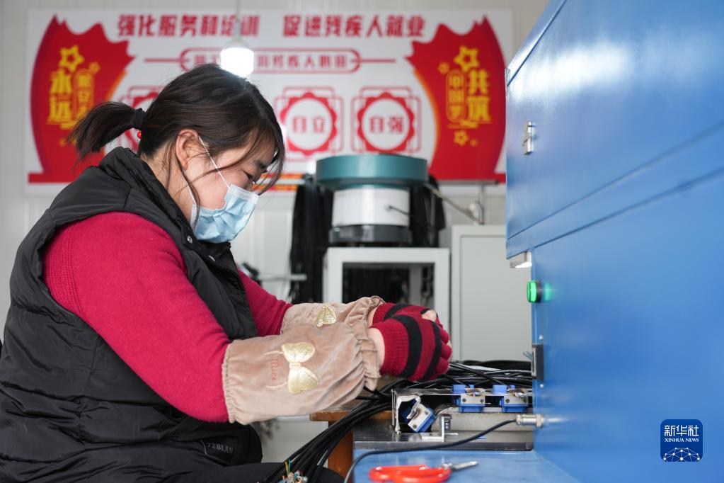 2月12日,在山东邹城市太平镇如康家园内,残疾人在进行电缆加工。