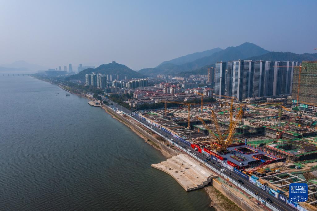 空中俯瞰富春江畔秦望通道工程过江隧道江北工作井施工现场(3月9日摄,无人机照片)。