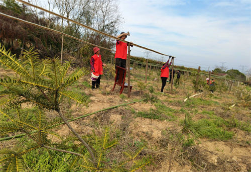 2023年3月10日,安徽省合肥市庐江县石头镇黄牛山种养殖专业合作社香榧基地内,工人们正在移栽香榧苗,搭建遮阳棚,进一步扩大基地香榧种植面积。
