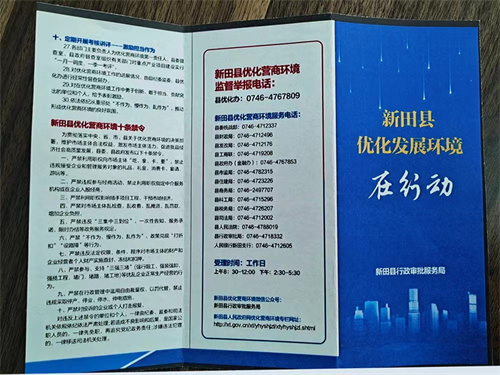 3月13日,新田县行政审批服务局编印了《新田县优化发展环境在行动》宣传折页,聚焦“该办能办创办”,公开举报途径服务电话、微信公众号、网站等举报受理机制,构建起网上网下、全方位全覆盖举报网络,并对实名举报、提供证据材料且立案查实的举报人员进行奖励。