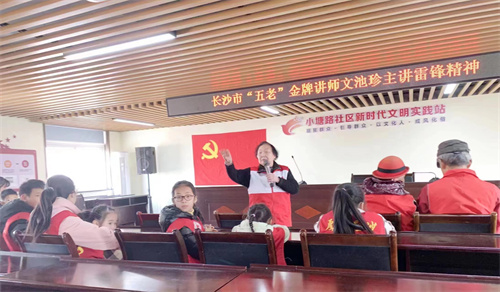 活动四:长沙市“五老”金牌讲师文池珍演讲《学雷锋争当美德少年》,小学生谭凌萱认真回答说,我学懂了雷锋的五种精神:学习的钉子精神,敬业的螺丝钉精神等...并说,我一定做雷锋传人,发扬红十字的博爱精神。