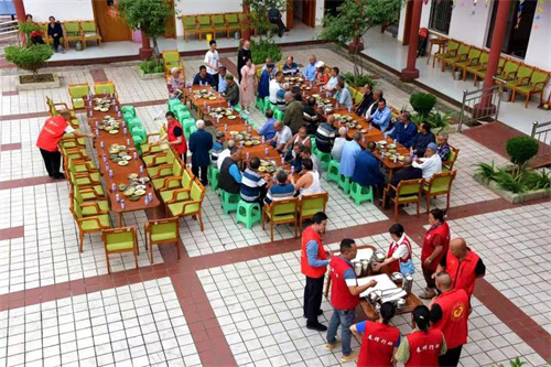 随着午后的用餐临近,志愿者们又协助养老服务中心工作人员一起,齐心合力在该中心广场摆上长桌宴,把事前采购拴有五彩绳的粽子、精心烹饪的10个菜肴摆在餐桌上,与老人们共同分享长宴美食,并祝老人们端午安康!端午吉祥、身体健康!
