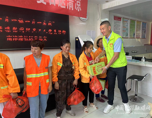 上午11时,冒着近40℃的高温,岳阳市贤因公益协会创始人、贤恩新能源董事长、岳阳楼区新阶联副主席蔡镇业、当归蛋铺负责人周成钰带领爱心志愿者们将购买的王老吉、水果等物品送到南津港社区环卫工人手中。大家还详细了解了夏季高温环境中环卫工人是如何工作的,并向高温天气下依然坚守平凡岗位、为城市做好“美容”的一线环卫工人表示衷心感谢。
